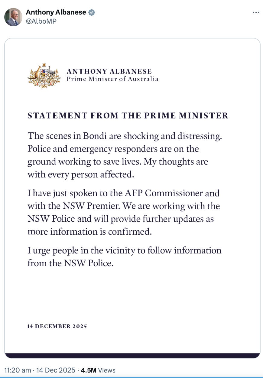 In the aftermath of this modern day pogrom, Australian Prime Minister Anthony Albanese issued a statement in which he made no mention whatsoever of Jews, antisemitism, Hanukkah, Islamic extremism, terrorism or ISIS. Albanese referred to the massacre merely as “shocking” and “distressing” and said that his thoughts were with “every person affected.”